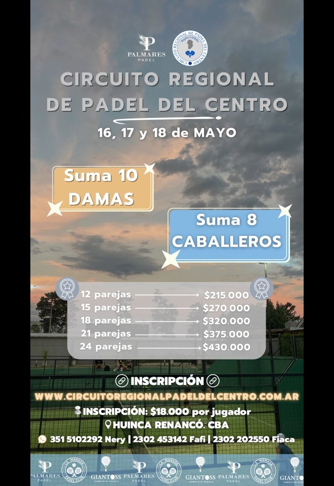 »» Evento: SUMA 8 CAB. / SUMA 10 DAMAS - PALMARES PADEL »» Localidad: Huinca Renancó »» Fechas: 16/05/2025 al 18/05/2025